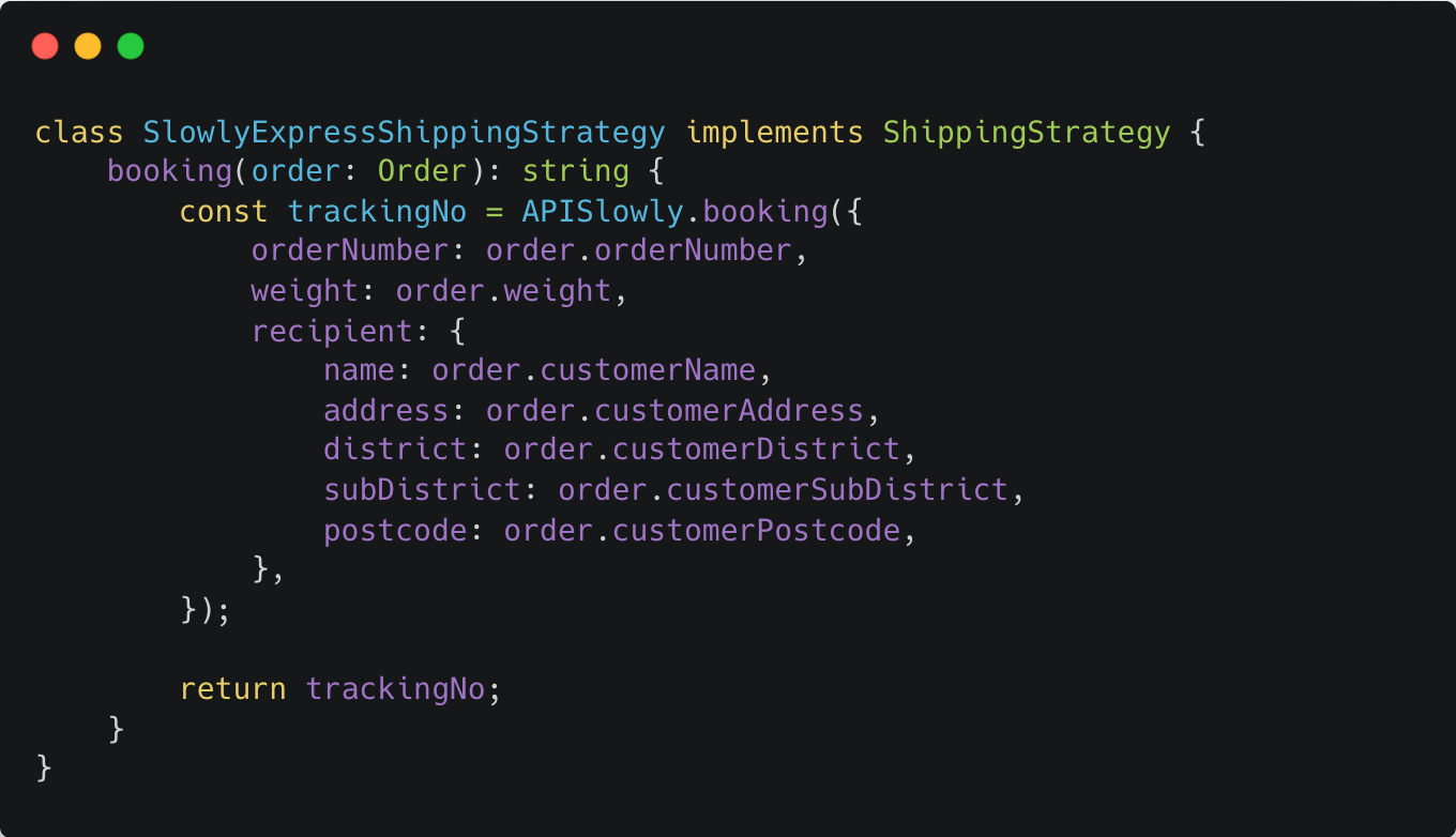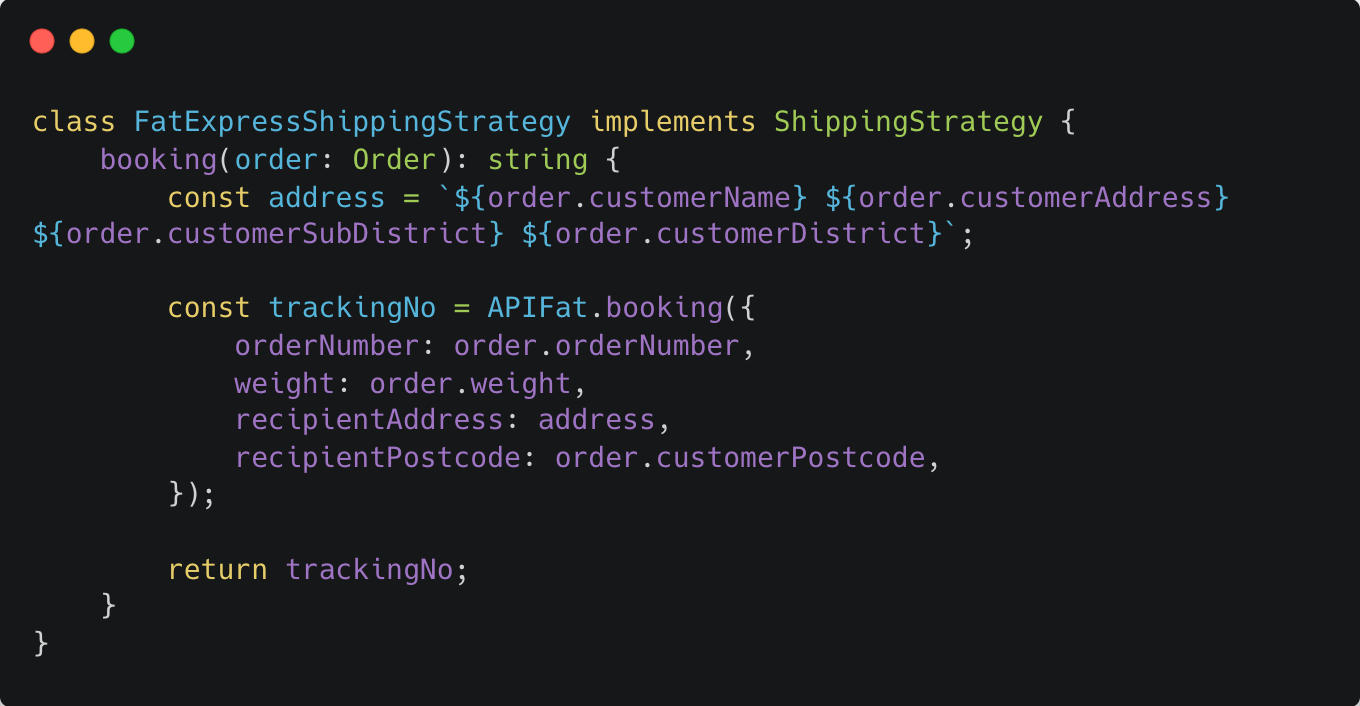 สุดท้ายเมื่อเราต้องการที่จะเพิ่มการเชื่อมต่อ API กับขนส่งเจ้าใหม่ๆ ก็เพียงแค่สร้าง Class Strategy อันใหม่ขึ้นมา เขียน Implementation Detail เข้าไป และเพิ่ม if-else ส่วนการเลือก Strategy สำหรับขนส่งนั้นๆ ที่ Function getShippingStrategy ก็เป็นอันเสร็จสิ้น จะเห็นได้ว่า Code ที่เฉพาะเจาะจงของแต่ละขนส่งนั้นจะอยู่ภายใต้ Strategy ของตัวเองเท่านั้น ทำให้ Code แก้ไข และ Maintenance ได้ง่ายครับ