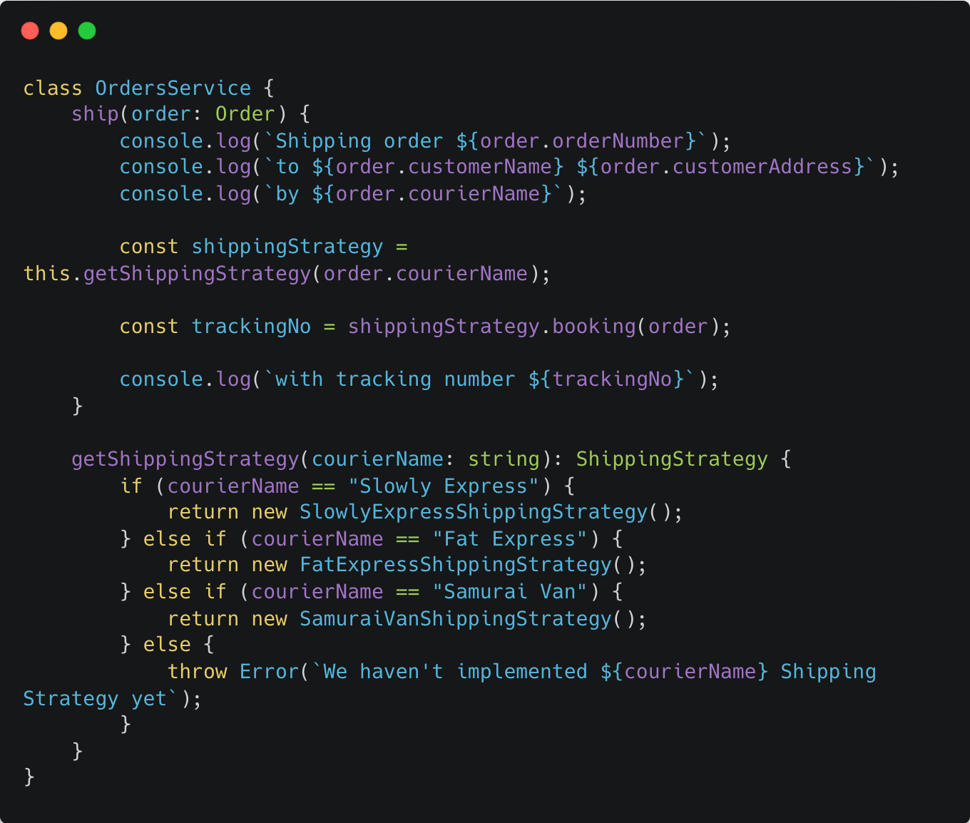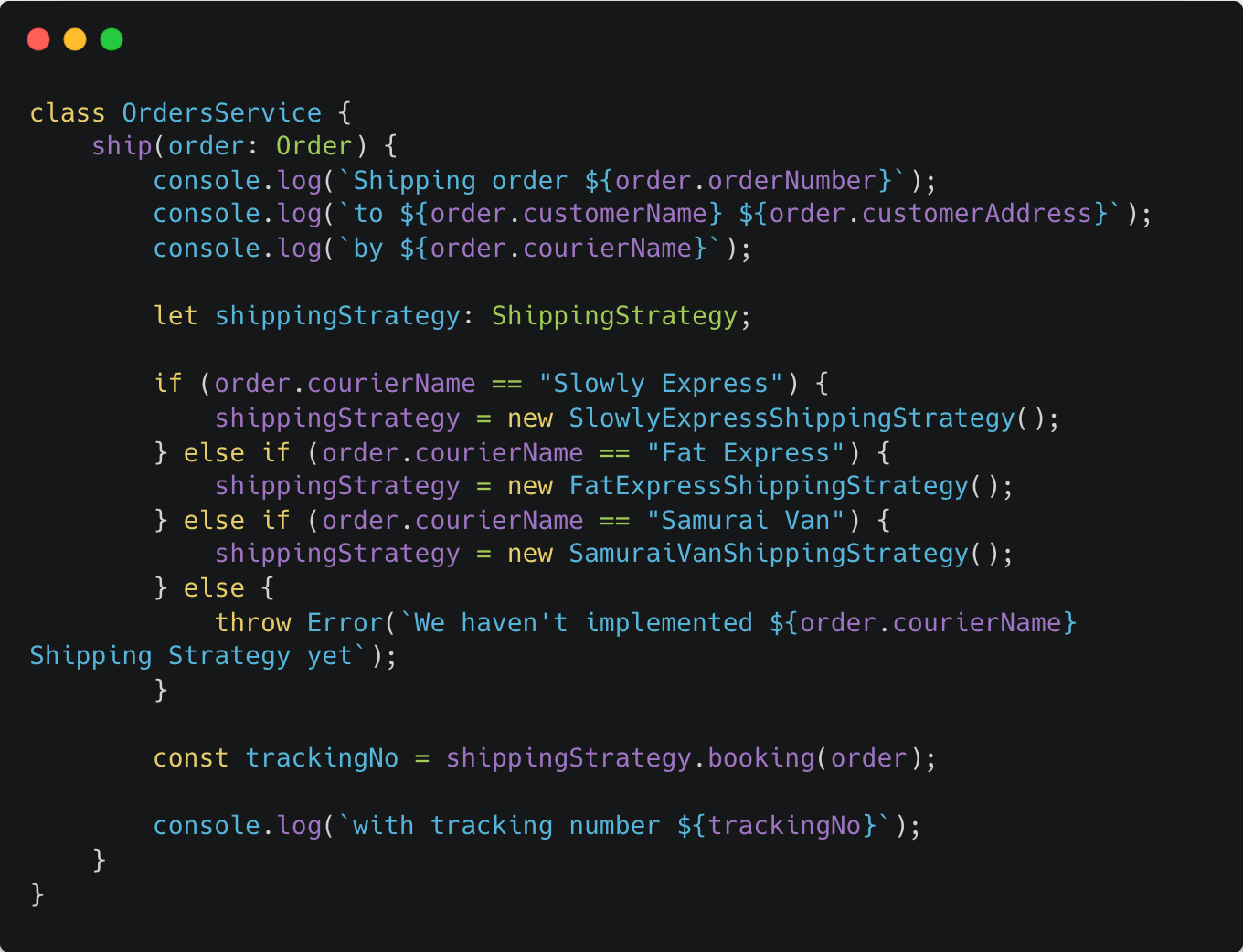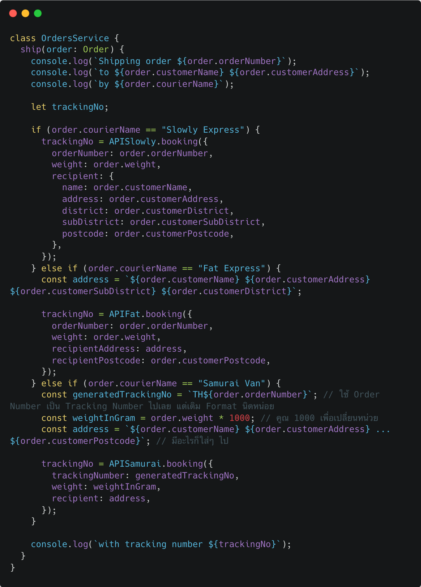 ต่อไปเราจะทำการ Refactor ในส่วนของ Class OrdersService เพื่อทำการเรียกใช้ Strategy เหล่านี้กันครับ โดยวิธีการคือ ให้เราสร้างตัวแปรเพื่อเก็บ Strategy ขึ้นมา และทำการ Instantiate Strategy ที่เราต้องการใช้ใน if-else ที่เป็นตัวแบ่งขนส่งแต่ละเจ้าครับ ถ้าอ่านแล้วงงๆ ลองมาดู Code กันครับ