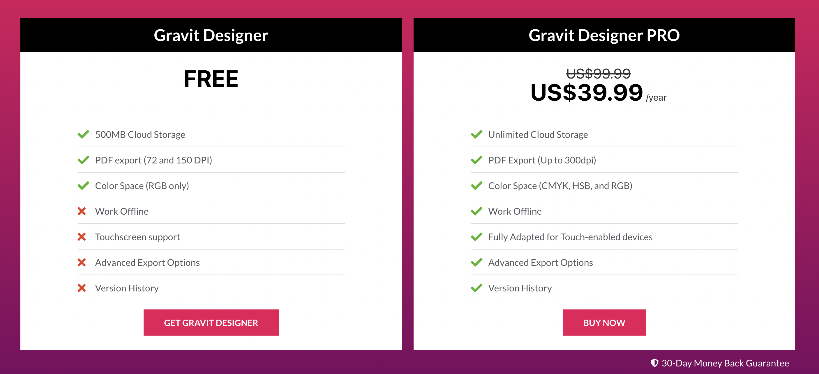 ส่วนในเวอร์ชัน PRO ตัว Gravit Designer มีพื้นที่จัดเก็บบนคลาวน์แบบไม่จำกัด มีความสามารถในการ Export ไฟล์ PDF คุณภาพสูงสุด 300dpi มี Colour Space ให้เลือกทั้ง CMYK, HSB และ RGB สามารถใช้งานแบบ Ofline มีความโดดเด่นในเรื่องของ Advanced Export Options หรือตัวเลือกการส่งออกขั้นสูง และรองรับ Version History ในกรณีที่เราต้องการตรวจทานดูว่าเราแก้ไขงานไปเมื่อไหร่อีกด้วย